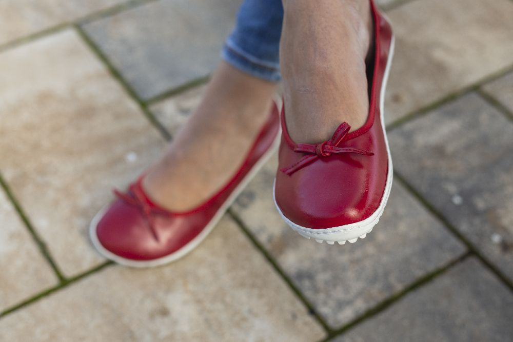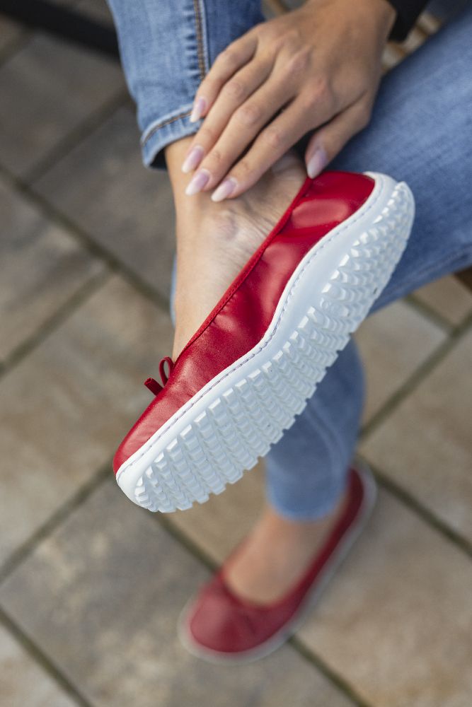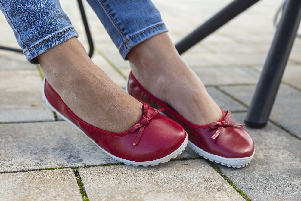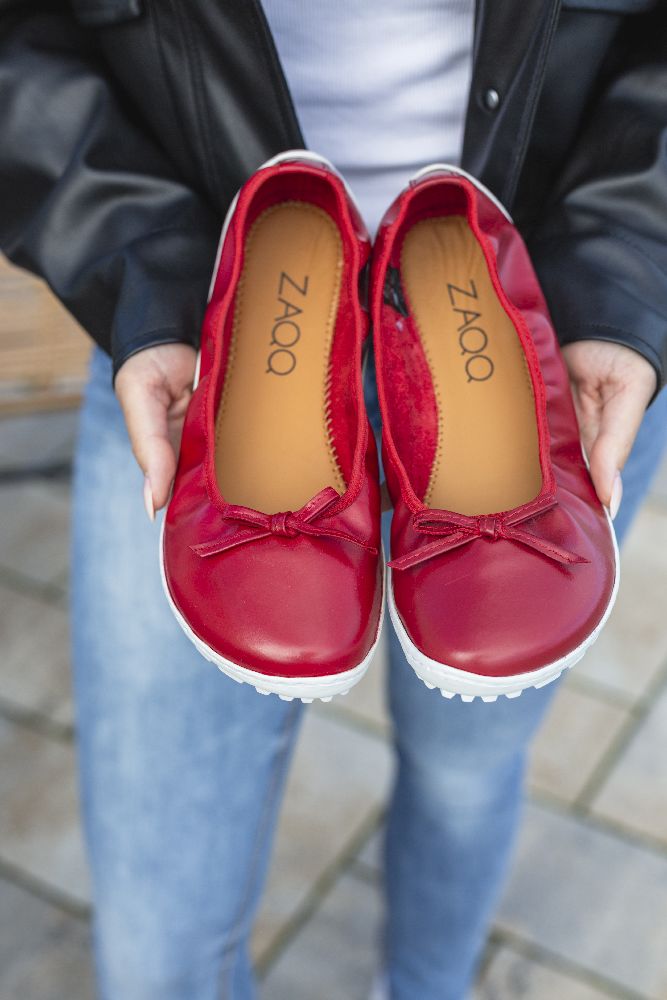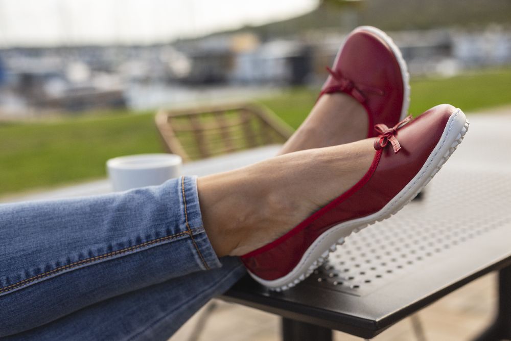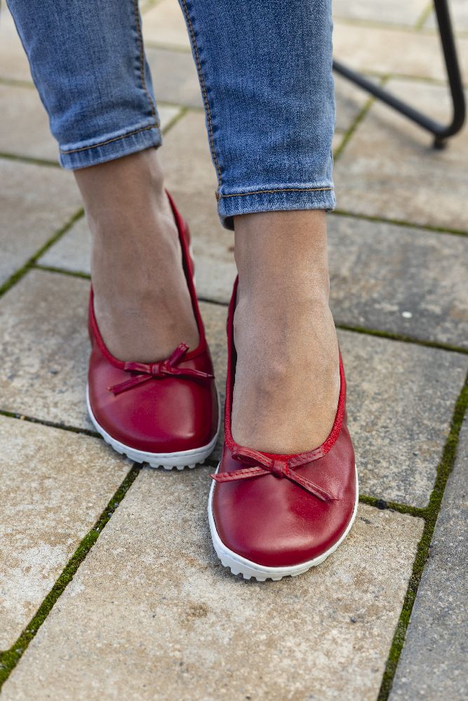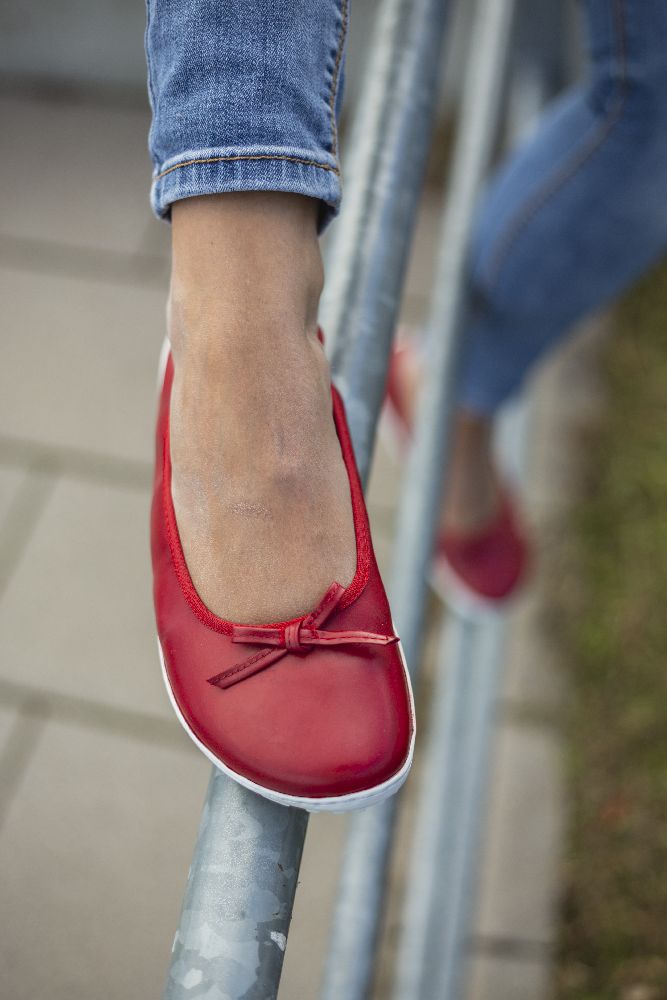 Le cuir lisse rouge fin et foncé et la boucle subtile donnent à la ballerine un look délicat et féminin. Grâce à la semelle des baskets cassée, il a l'air sportif, frais et moderne. La semelle aux pieds nus assure également une bonne adhérence et en même temps est si mince et flexible que vos pieds ressentent le sol à chaque pas.