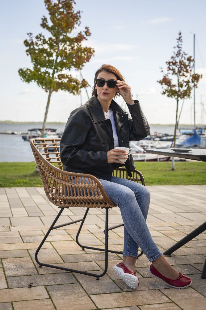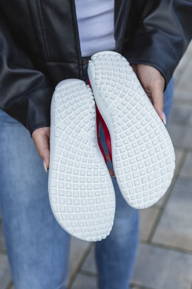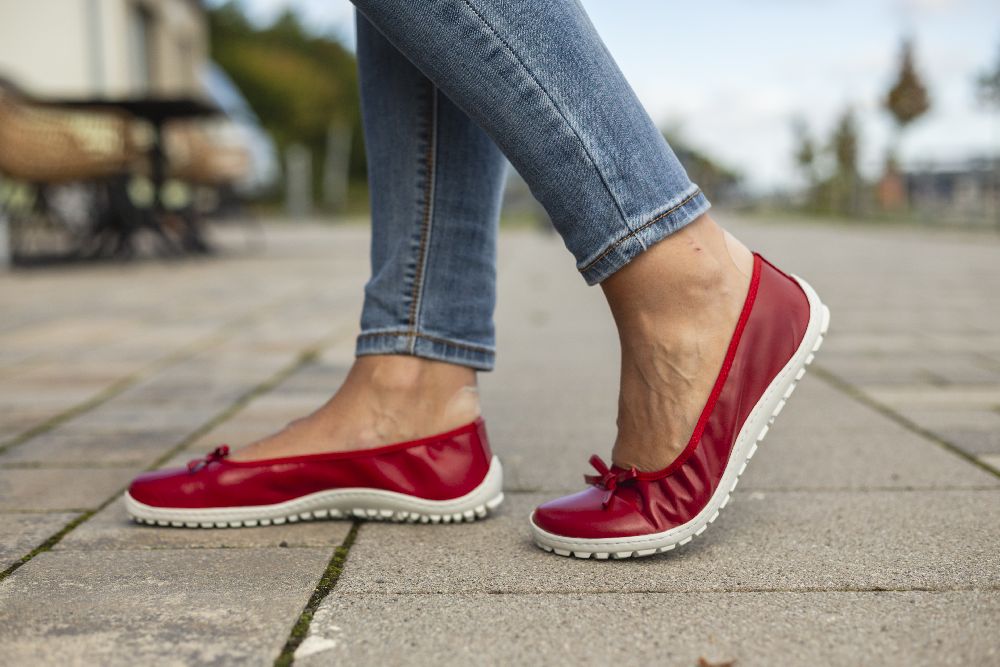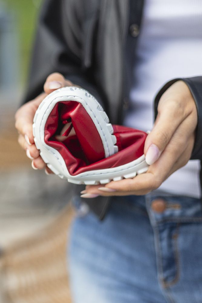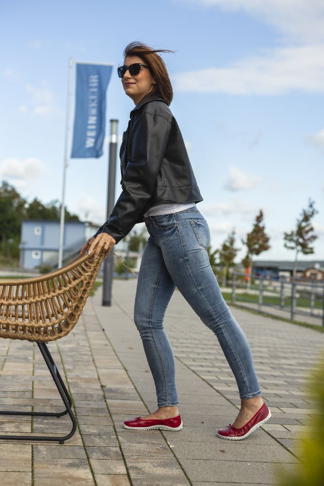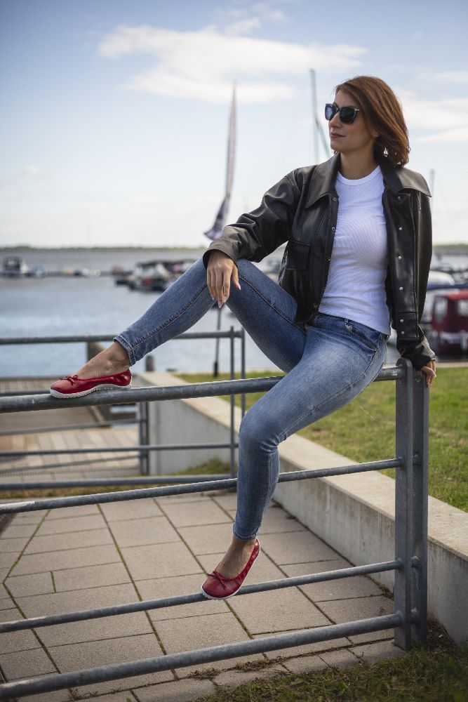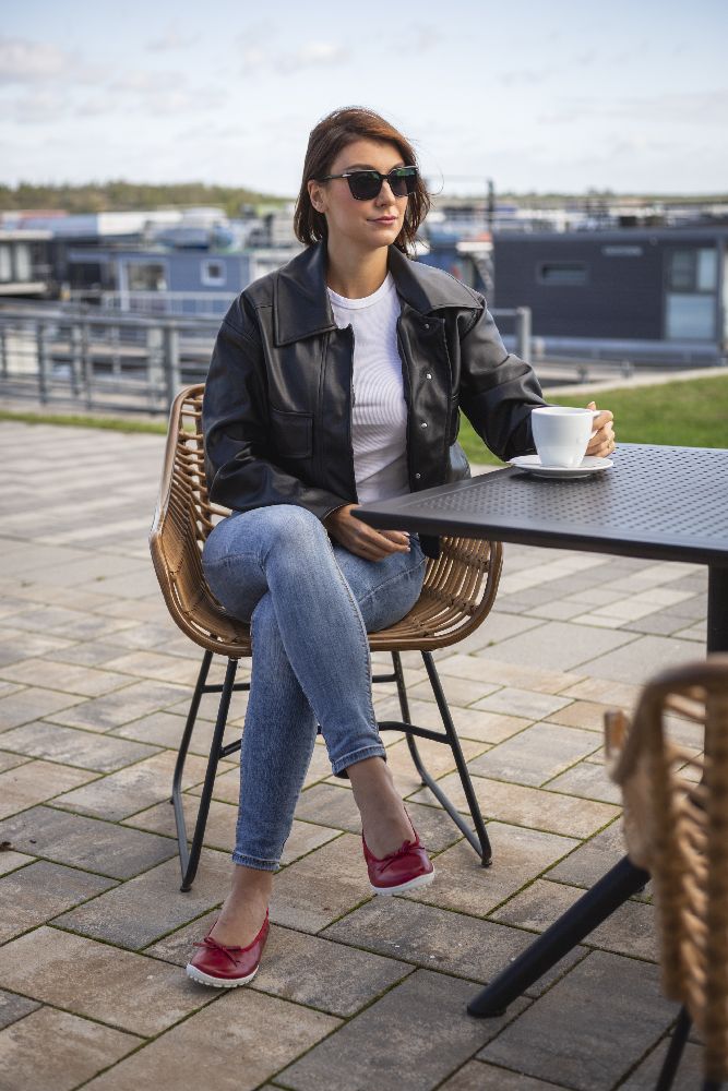 Le cuir lisse rouge fin et foncé et la boucle subtile donnent à la ballerine un look délicat et féminin. Grâce à la semelle des baskets cassée, il a l'air sportif, frais et moderne. La semelle aux pieds nus assure également une bonne adhérence et en même temps est si mince et flexible que vos pieds ressentent le sol à chaque pas.