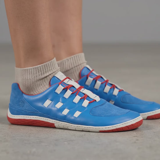 Pour cette chaussure aux pieds nus, nous utilisons des nappa et du daim premium fins en bleu ciel. Combiné avec des accents blancs et des lacets orange, un design ultra-moderne est créé, ce qui vous donne un coup de pied d'énergie lorsque vous voyez.