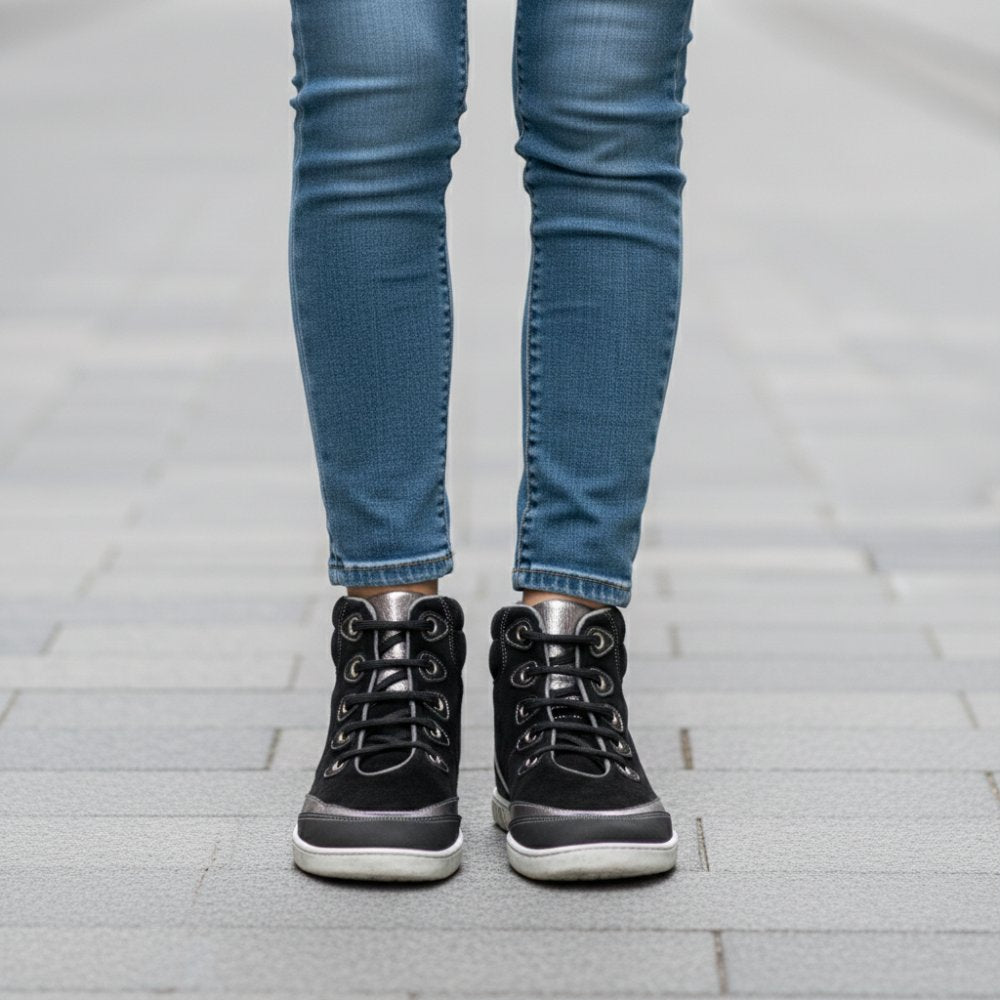Pour cette sneaker à demi-high, nous utilisons le daim doux, que nous avons combiné avec des inserts en cuir Nappa à couleur argentée. Notre Cinqo a simplement l'air et a toujours une pincée extravagante. En tant qu'autre élément de conception, nous avons cousu le tissu en filet foncé dans les zones particulièrement stressées, ce qui est particulièrement robuste et garantit que la chaussure pieds nus est extrêmement durable.