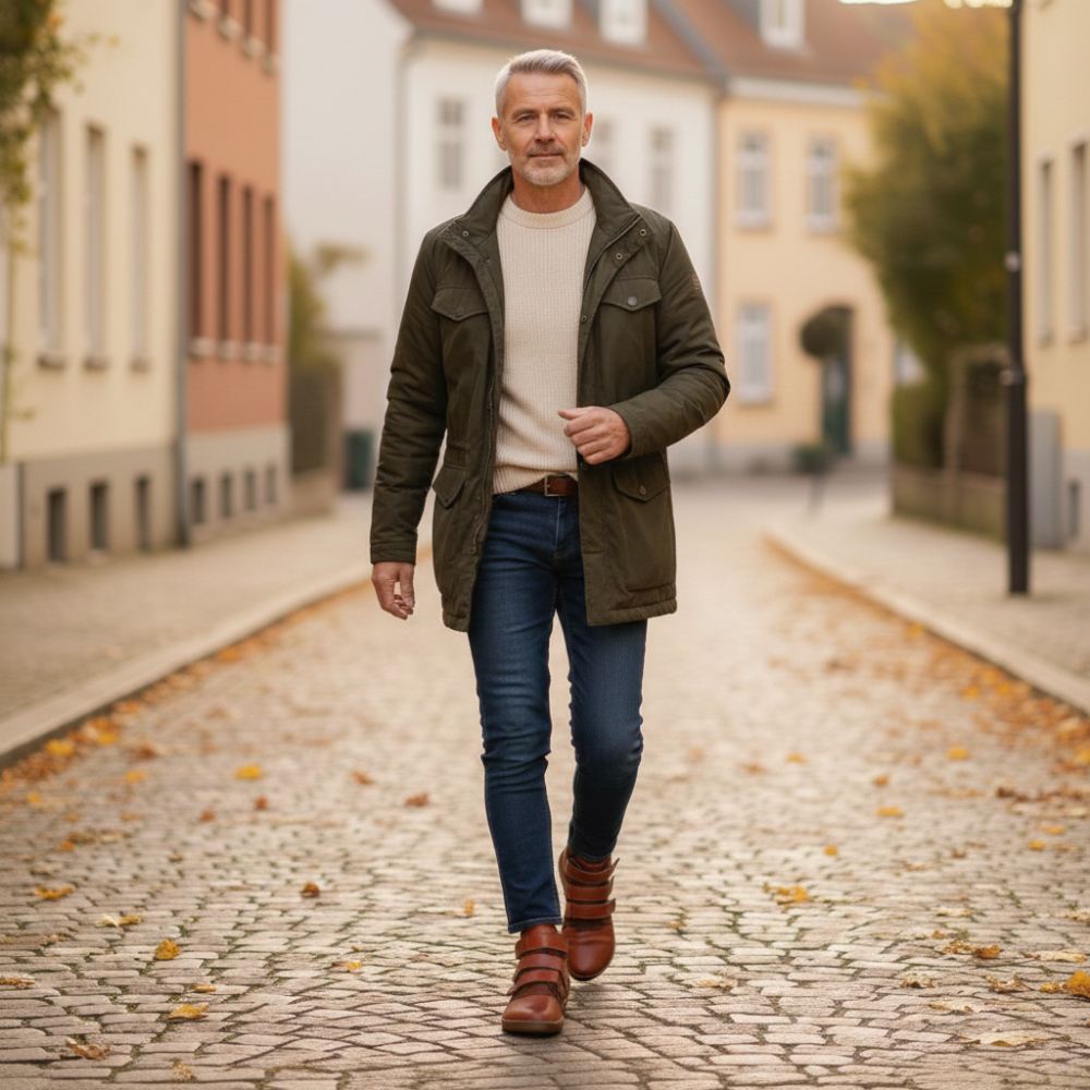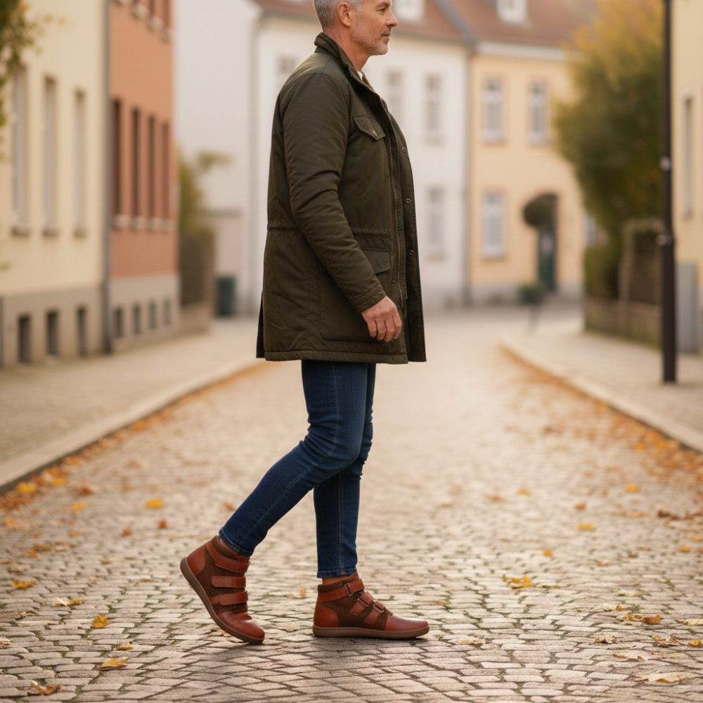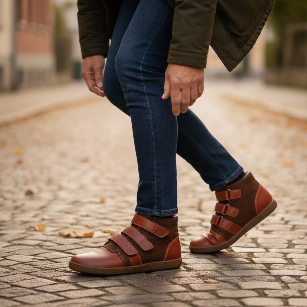 Qooper est la chaussure aux pieds nus à moitié, qui a l'air particulièrement noble en raison de son cuir marron et est tout simplement incroyablement confortable avec la fixation du velcro pratique.
