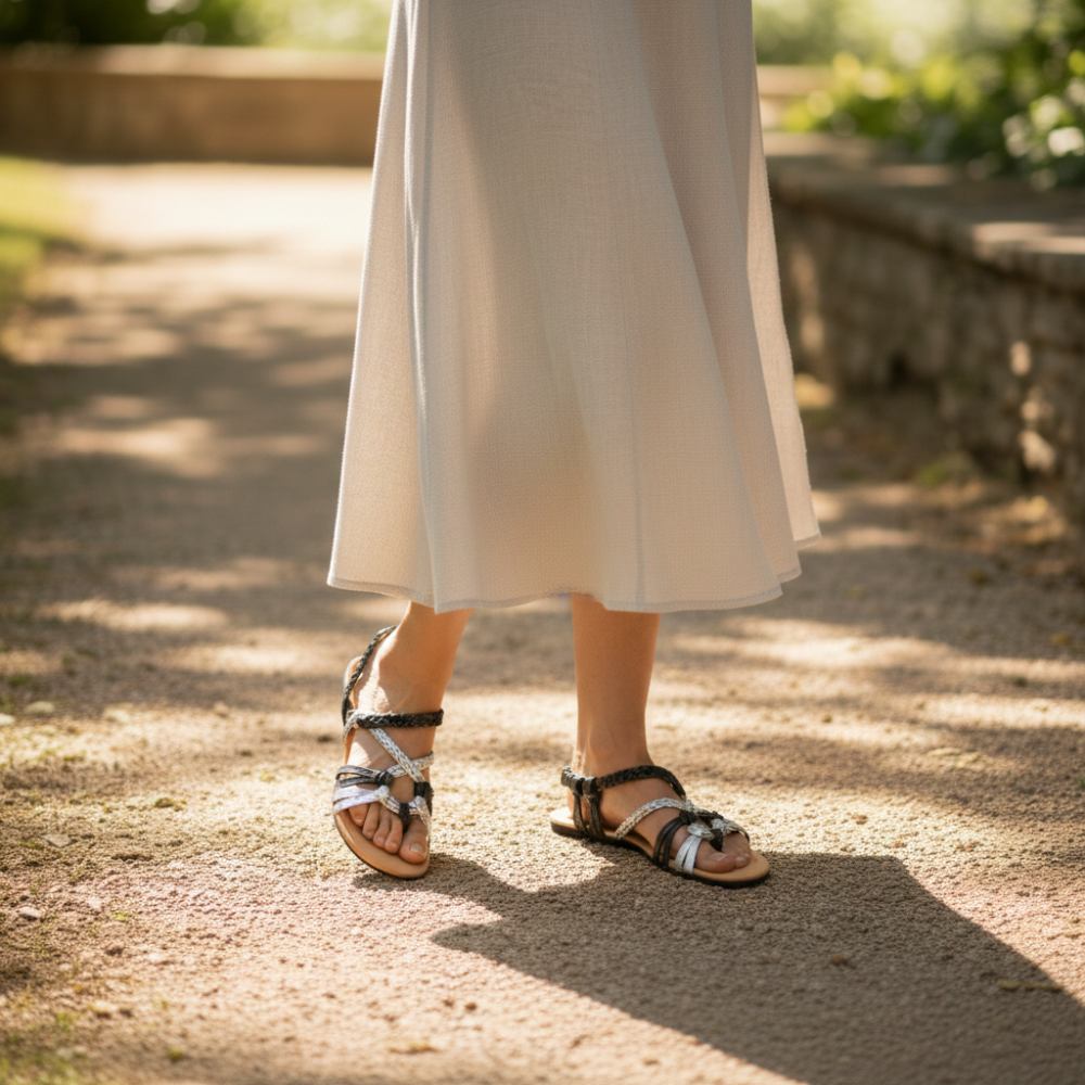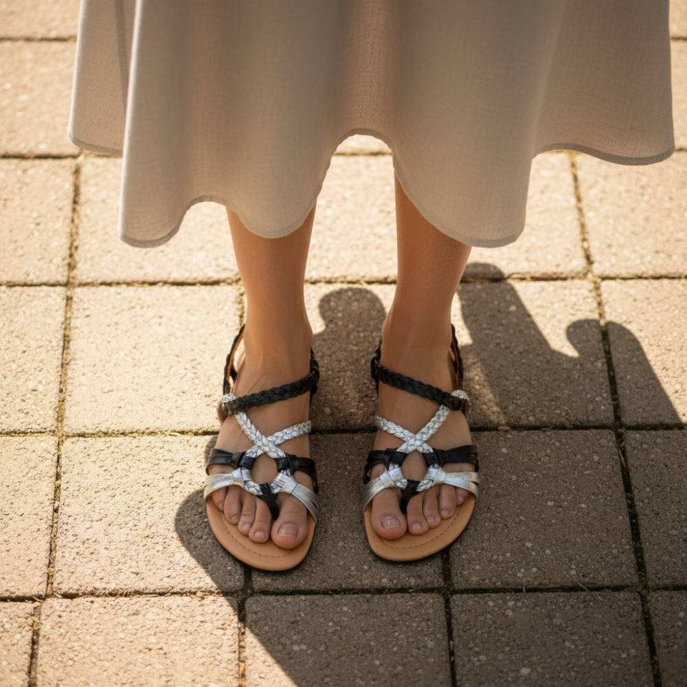 Les sangles en noir et argent courent sous une forme inhabituelle, parfois tressée, parfois nouée. Cela constitue l'apparence féminine des sandales pieds nus. Et le meilleur de tous: vous n'avez rien à ouvrir pour glisser, car nous avons incorporé une bande élastique à l'arrière de la sangle. Il est plus facile de mettre et d'enlever une sandale.