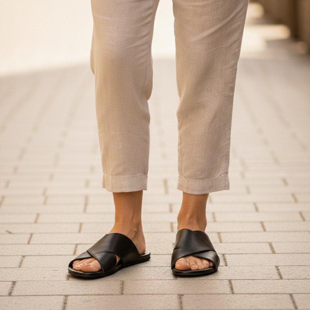 Avec deux sangles en cuir croisées qui offrent le meilleur arrêt, vous pouvez simplement vous glisser dans les sandales noires de Manqa et profiter pleinement de votre journée. Pas de boucles, pas de fioritures - juste un pur confort et une liberté pour vos pieds. Ces sandales combinent la légèreté d'une chaussure pieds nus avec l'élégance d'un accessoire à la mode.