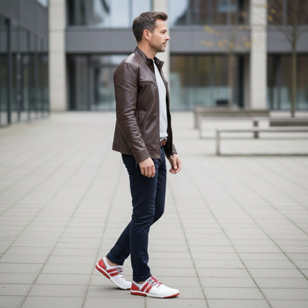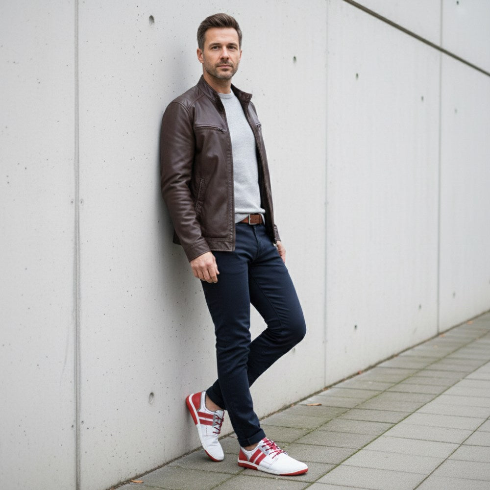 Avec son jeu de couleurs réussi en blanc et en rouge, la sneaker a l'air fraîche et s'intègre parfaitement dans la moitié plus chaude de l'année. Pour Qanberra, nous utilisons du cuir nappa blanc finement perforé, qui garantit une activité respiratoire élevée. Donc, vos pieds se sentiront dans la sneaker même les jours les plus chauds de l'année sans briller.