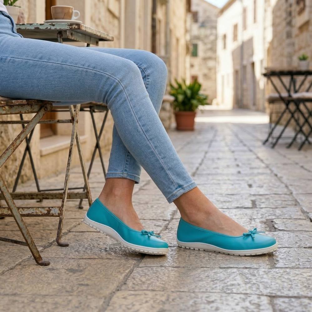 Suqar Capri - Le nom est le programme! Le cuir nappa bleu rappelle les belles couleurs de la Méditerranée. La ballerine avec sa boucle ornementale féminine est également comme un bonbon qui ne peut pas être résisté.