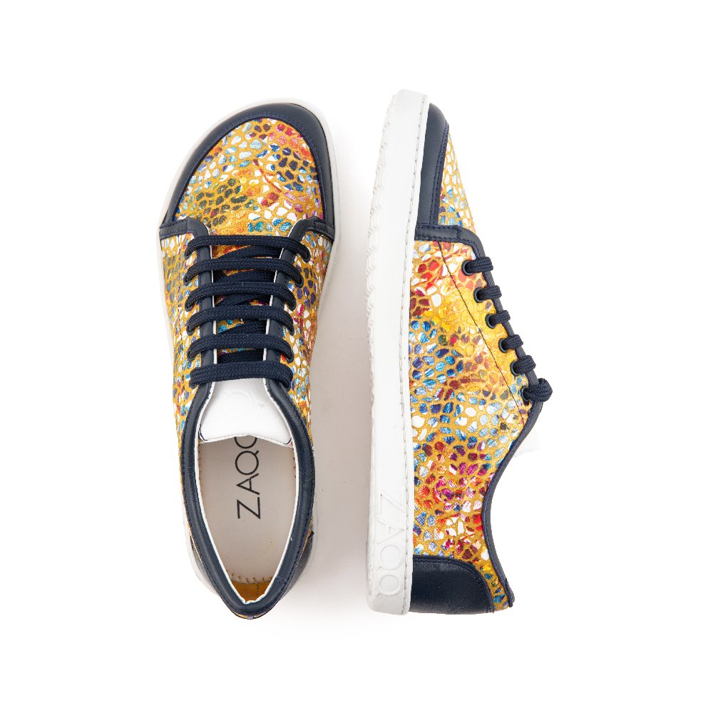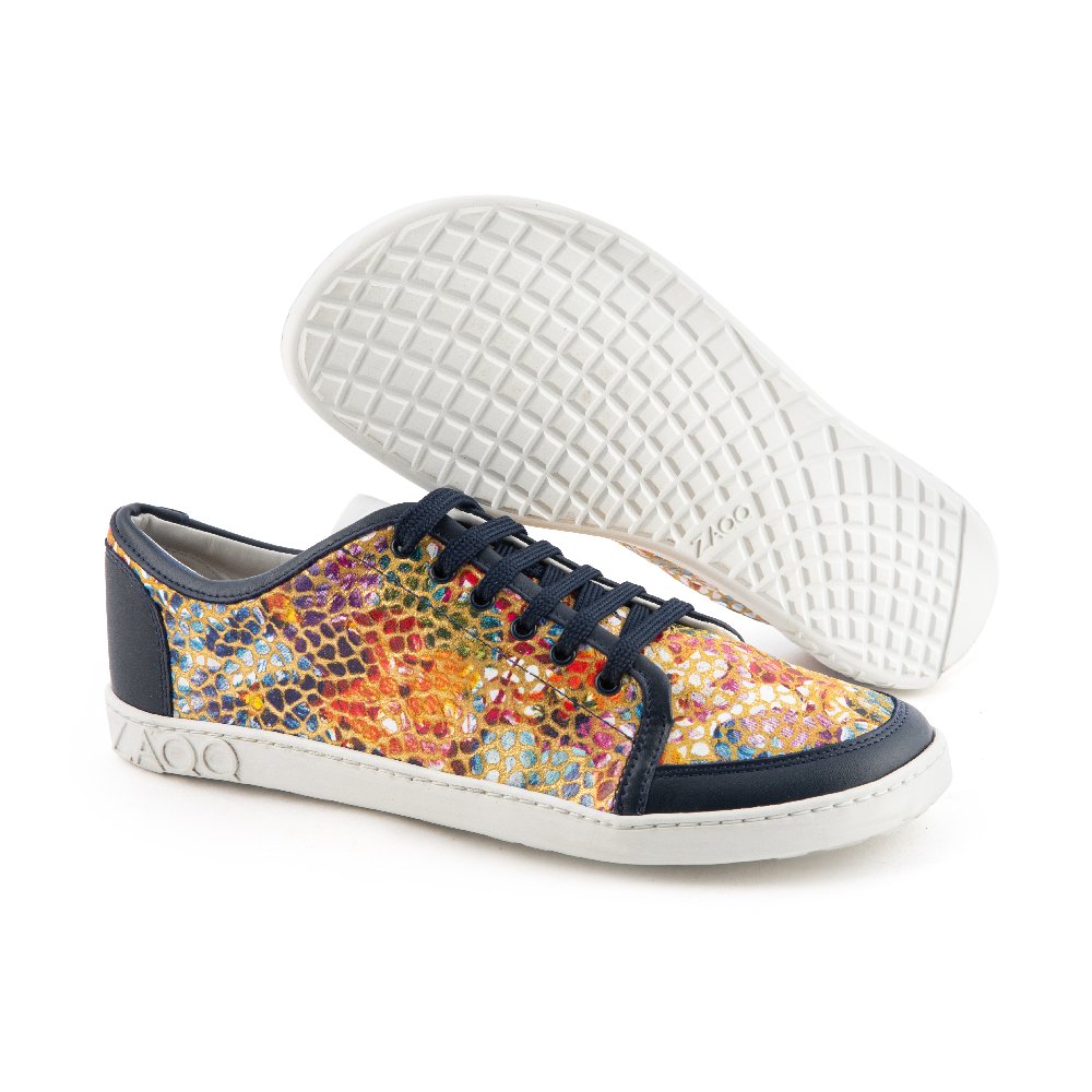 Fabriqué en cuir Nappa de haute qualité avec un motif de fleurs coloré et des détails de décalage en bleu foncé, cette chaussure aux pieds nus est un halage à œil absolu! Mais cette sneaker est également phénoménale pour vos pieds - il offre beaucoup d'espace pour les orteils et en même temps sûr en toute sécurité sur les chevilles.